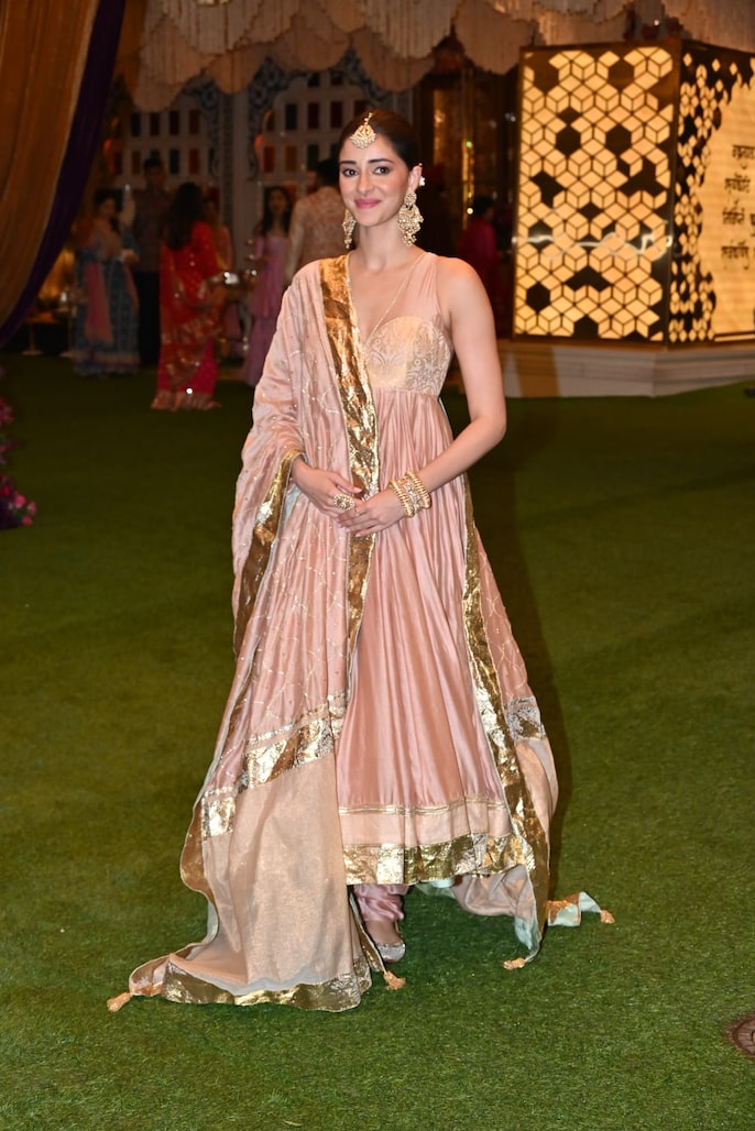Nita Ambani, the groom’s mother, made a rare sartorial choice by opting for a stunning golden suit designed by Manish Malhotra, instead of her usual lehengas and sarees for such events. The suit boasted a detailed silver chatai technique border and silver embroidery on the cuffs, complemented by a double-drape dupatta adorned with antique and zardozi embroidery.
